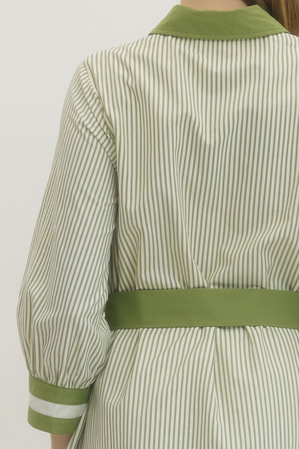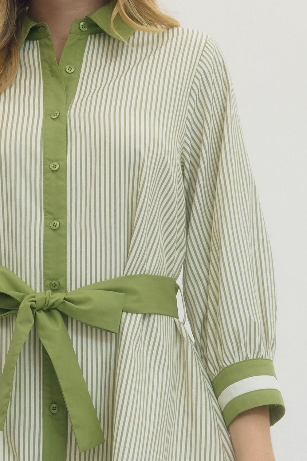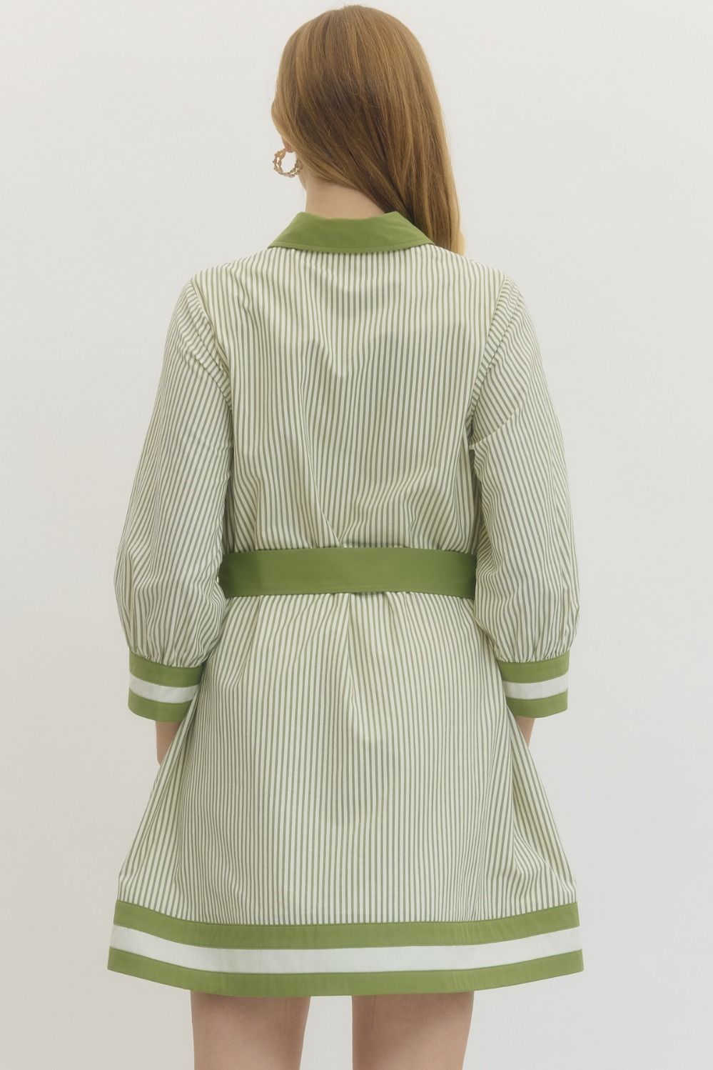 Stripe pattern ¾ sleeve mini waist tie mini dress featuring contrast collar band button front closure with multicolor sleeve band and hem detail. Lined. Woven. Non-sheer. Lightweight.